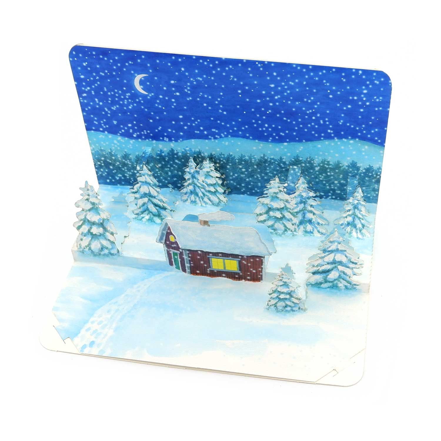 Da die Winter bei uns leider nicht so oft weiß sind, habe ich aus meiner Sehnsucht nach Schnee eine Pop-up-Karte gemacht. Beim Öffnen der Karte stellt sich ein Haus in einer nächtlichen Schneelandschaft auf, die der Mond bescheint. Um das Haus herum stehen zugeschneite Tannen und im Hintergrund ist ein Wald mit Hügeln im Schneetreiben zu erkennen. Die Karte ist auf der Rückseite beschreibbar und wird mit einem Couvert geliefert.