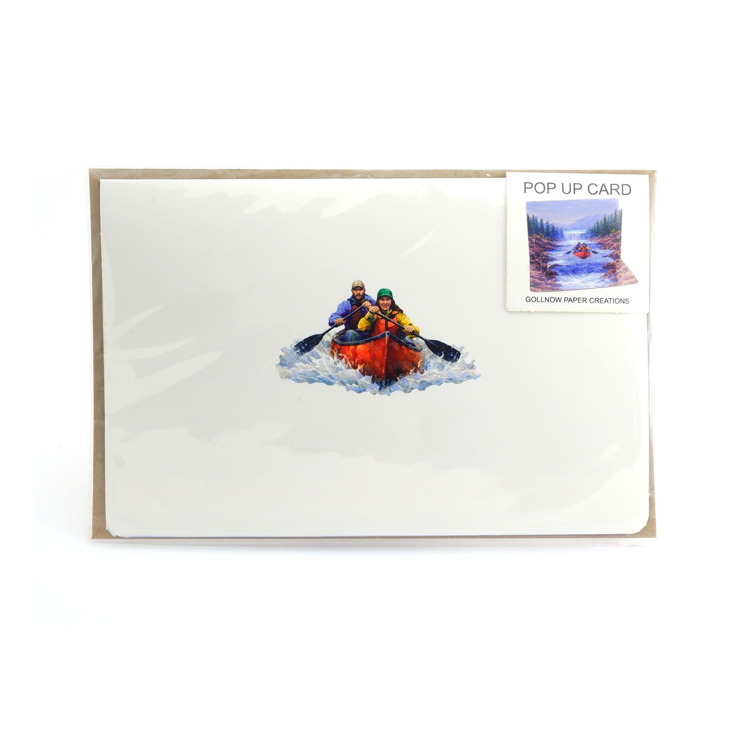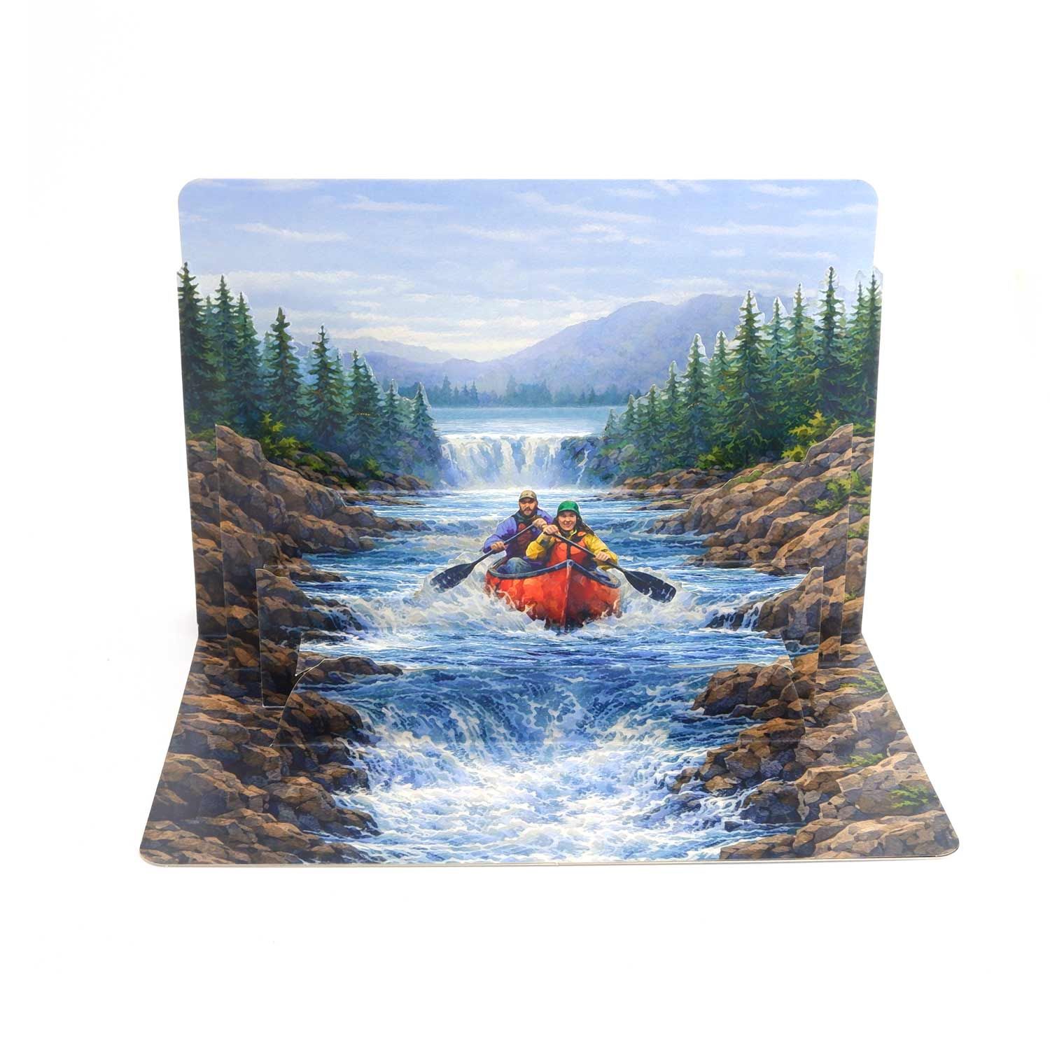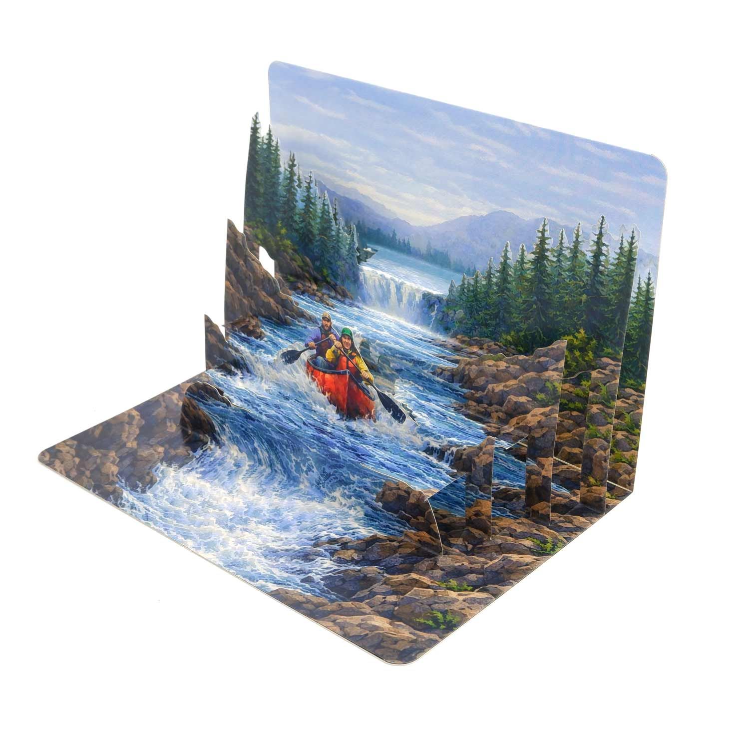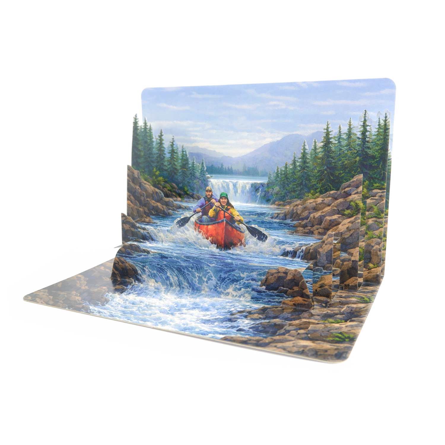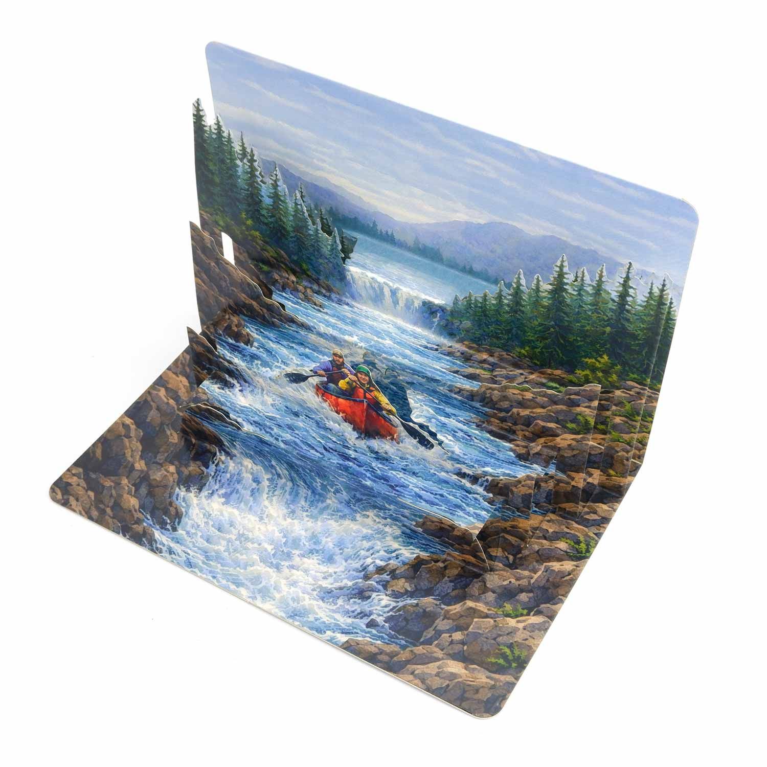 Eine Pop-up-Karte für alle Abenteurer und Naturfreunde. Dargestellt ist eine dreidimensionale Szenerie einer Kanufahrt durch einen Wildwasserfluß. Beim Öffnen der Grußkarte stellt sich der Wildwasserfluss in meheren Stufen hintereinander auf, wodurch eine starke Dreisimensionalität entsteht. Mitten in dem rauschenden Wildwasser fährt ein Kanu gekonnt durch die Stromschnellen. Die Pop-up-Karte ist auf der Rückseite beschreibbar und wird mit einem hochwertigen Couvert geliefert.