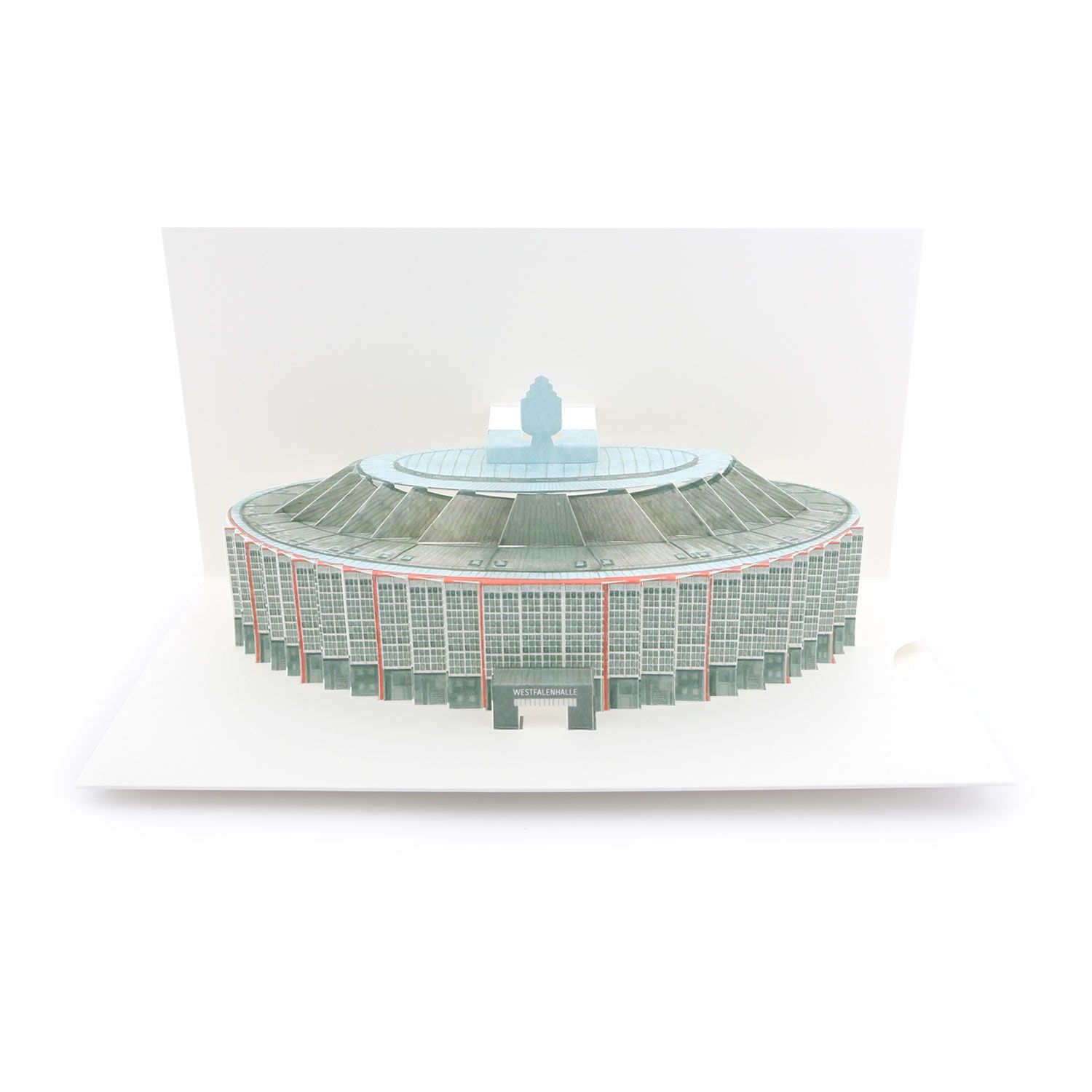 Von der wunderschönen Westfalenhalle in Dortmund habe ich eine filigrane Pop-up-Karte entwickelt und produziert. Die Karte wird unter anderem als Einladung zum 100 jährigen Jubiläum der Halle genutzt. Es gibt ein Einschubfach, in das eine Einladungskarte geschoben werden kann. Die Schwierigkeit bei der Gestaltung war es, die charakteristische Rundung der Westfalenhalle in der Pop-up-Karte umzusetzen. Dies habe ich mit einer Fächerung der Außenwand geschafft. Diese Fächerung mußte ich dann auch im gewölbten Dach der Halle fortsetzen, damit dieses auch dreidimensional wird und dem Original am so nächsten kommt. Bei einer solchen Karte sind viele Mustererstellungen nötig, bis das gewünschte Resultat erreicht wird.