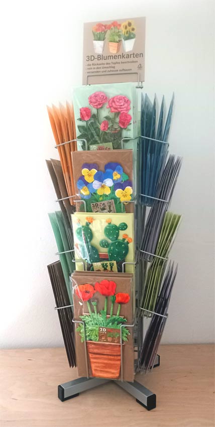 Als Wiederverkäufer haben Sie die Möglichkeit für die Ek-Preise zu bestellen. Bitte geben Sie beim Anlegen Ihres Kundenkontos Ihre Umsatzsteueridentifikationsnummer an. Danach können Sie die Ek-Preise einsehen und für diese Preise bestellen. Unsere Grußkarten sind für Wiederverkäufer immer zu 6 Stück gebündelt. Bitte bestellen Sie 6 oder 12 Karten und nicht 1 oder 2 Verpackungseinheiten. Mindestbestellmenge sind 72 Karten insgesamt, also z.B. 12 Motive zu 6 Karten. Wir bieten Ihnen auch Verkaufshilfen in Form von Displays an. Es gibt ein Tischdisplay mit 16 Fächern. Dieses ist gratis bei einer Bestellung von 8 Motiven zu 12 Karten. Ansonsten gibt es auch einen großen Drehständer mit bis zu 40 Fächern. Bitte setzen Sie sich dazu mit uns in Verbindung. Viel Spaß mit unseren Karten!